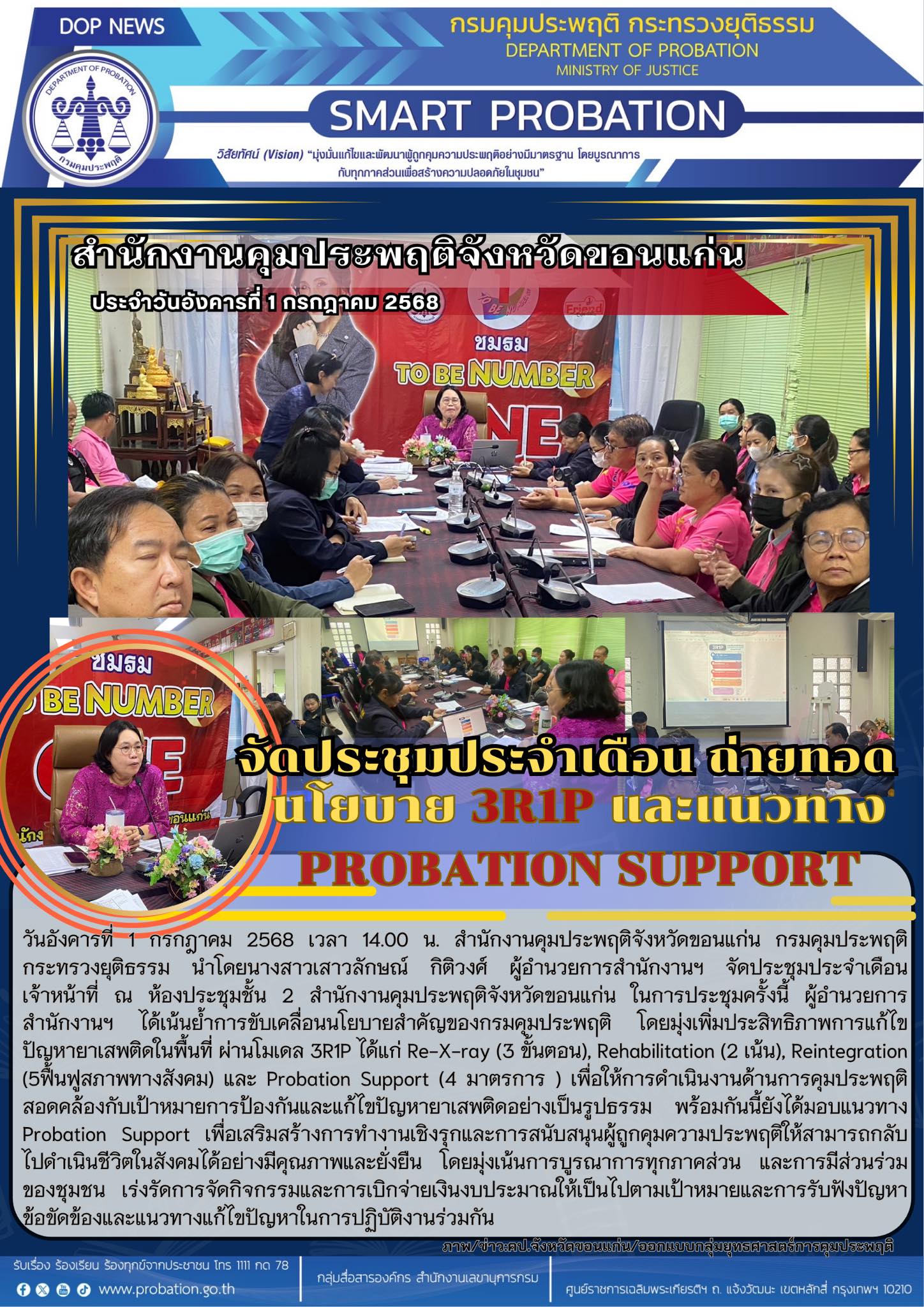 คุมประพฤติจังหวัดขอนแก่น จัดประชุมประจำเดือน ถ่ายทอดนโยบาย 3R1P และแนวทาง Probation Suppor