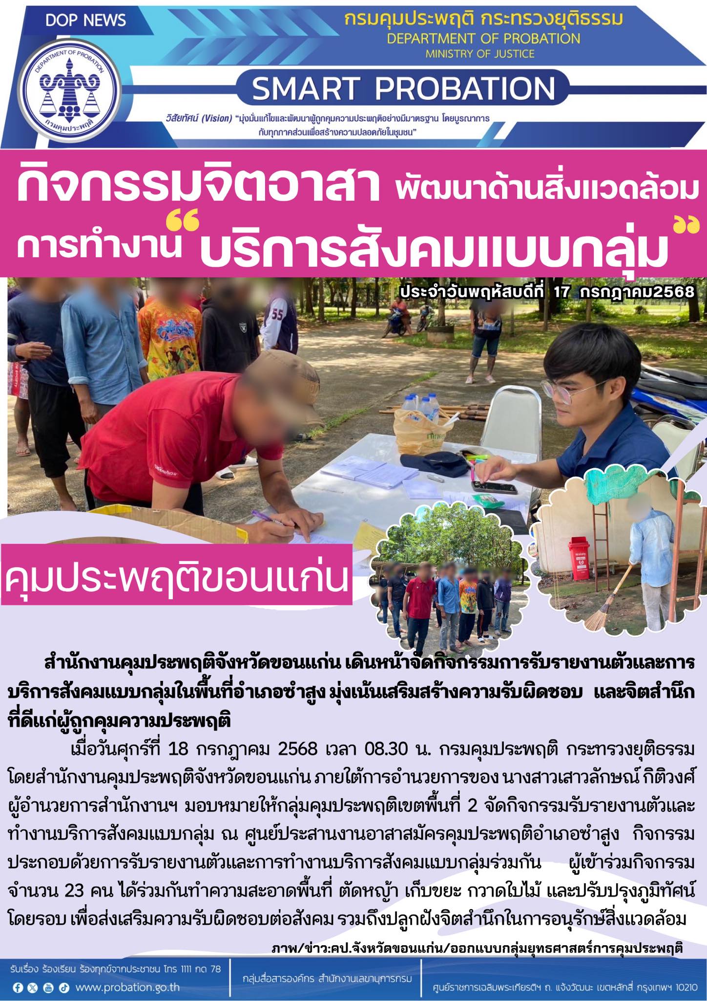 คุมประพฤติจังหวัดขอนแก่น จัดกิจกรรมจิตอาสาพัฒนาด้านสิ่งแวดล้อมการทำงานบริการสังคมแบบกลุ่ม